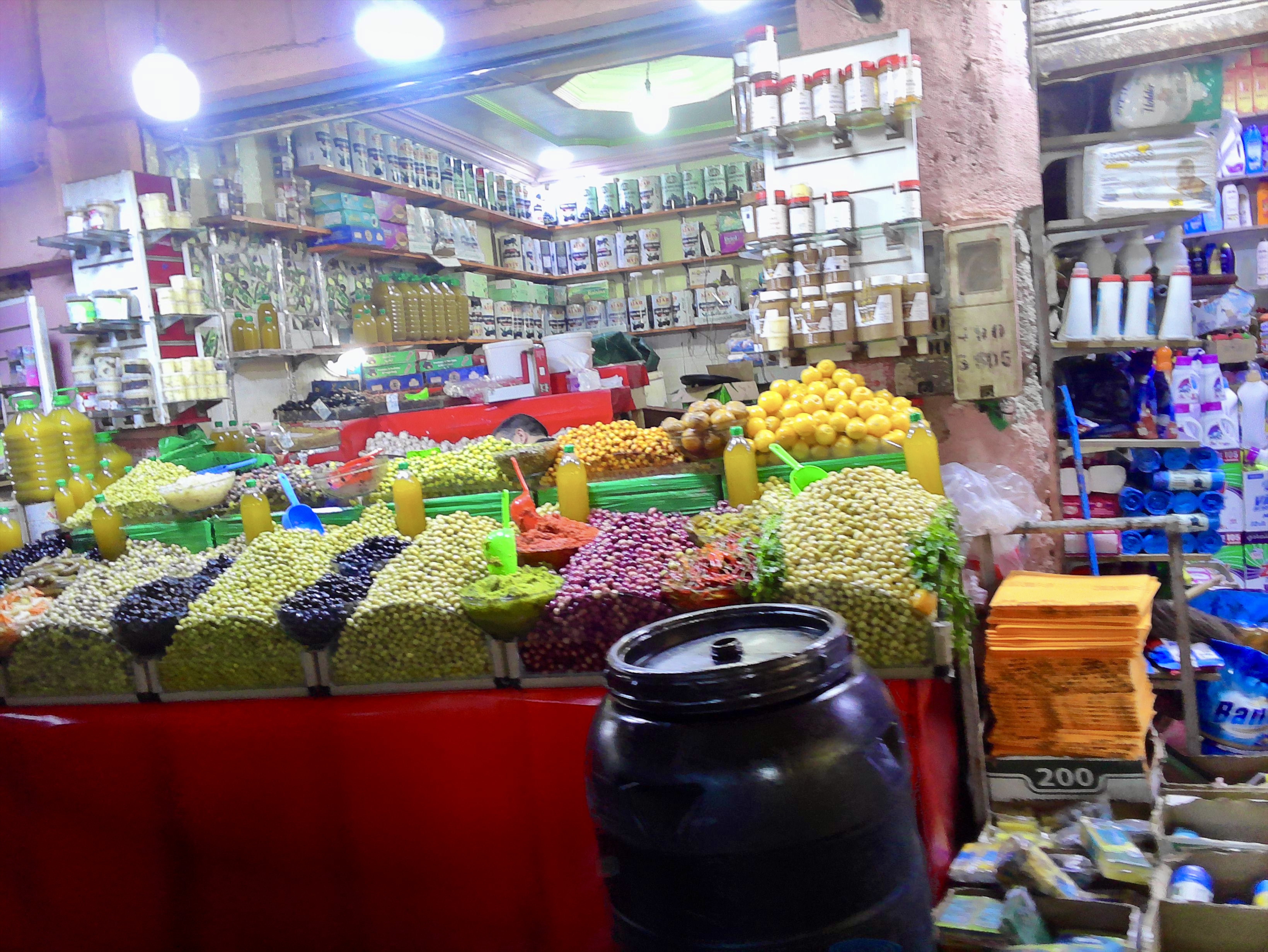 Następnie autobusem podjechaliśmy do supermarketu Marjane. Tłumy jak w PL w latach dziewięćdziesiątych a ceny przeciętnie atrakcyjne. Oliwki na wagę były tanie. 🙂